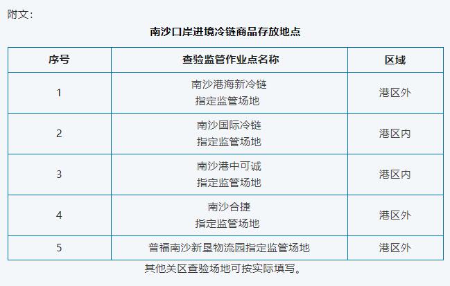 三、南沙國際冷鏈指定監(jiān)管場地計劃于10月25日開展冷鏈查驗作業(yè),但目前暫不具備凍肉和冰鮮水產(chǎn)品指定監(jiān)管場地資質(zhì),因此進口這兩種冷鏈產(chǎn)品的企業(yè)在填寫“貨物存放地點”時,不得填寫南沙國際冷鏈指定監(jiān)管場地作為“貨物存放地點”,其他冷鏈產(chǎn)品按第二條要求執(zhí)行。