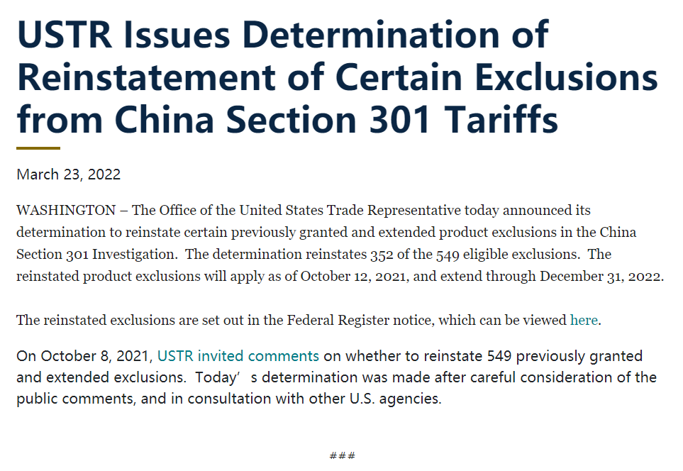 當?shù)貢r間23日,美國貿(mào)易代表辦公室發(fā)布聲明,宣布重新豁免對352項從中國進口商品的關稅,該新規(guī)定將適用于在2021年10月12日至2022年12月31日之間進口自中國的商品。