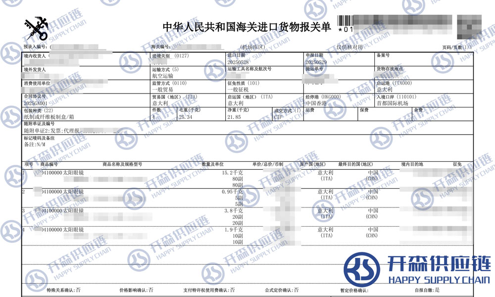 上述就是北京機(jī)場太陽眼鏡進(jìn)口報關(guān)代理服務(wù)【清關(guān)案例】的全部內(nèi)容,希望能對您有所幫助,如有進(jìn)口報關(guān),進(jìn)口報關(guān)代理公司,進(jìn)口報關(guān)代理上任何疑問及問題可隨時在線聯(lián)系我們或撥打 18002611553,開森供應(yīng)鏈擁有豐富的進(jìn)口報關(guān),進(jìn)口報關(guān)代理公司,進(jìn)口報關(guān)代理操作經(jīng)驗及案例,10余年進(jìn)口經(jīng)驗為您所用,各類進(jìn)口疑難都能為您一一解答及協(xié)助快速處理解決!